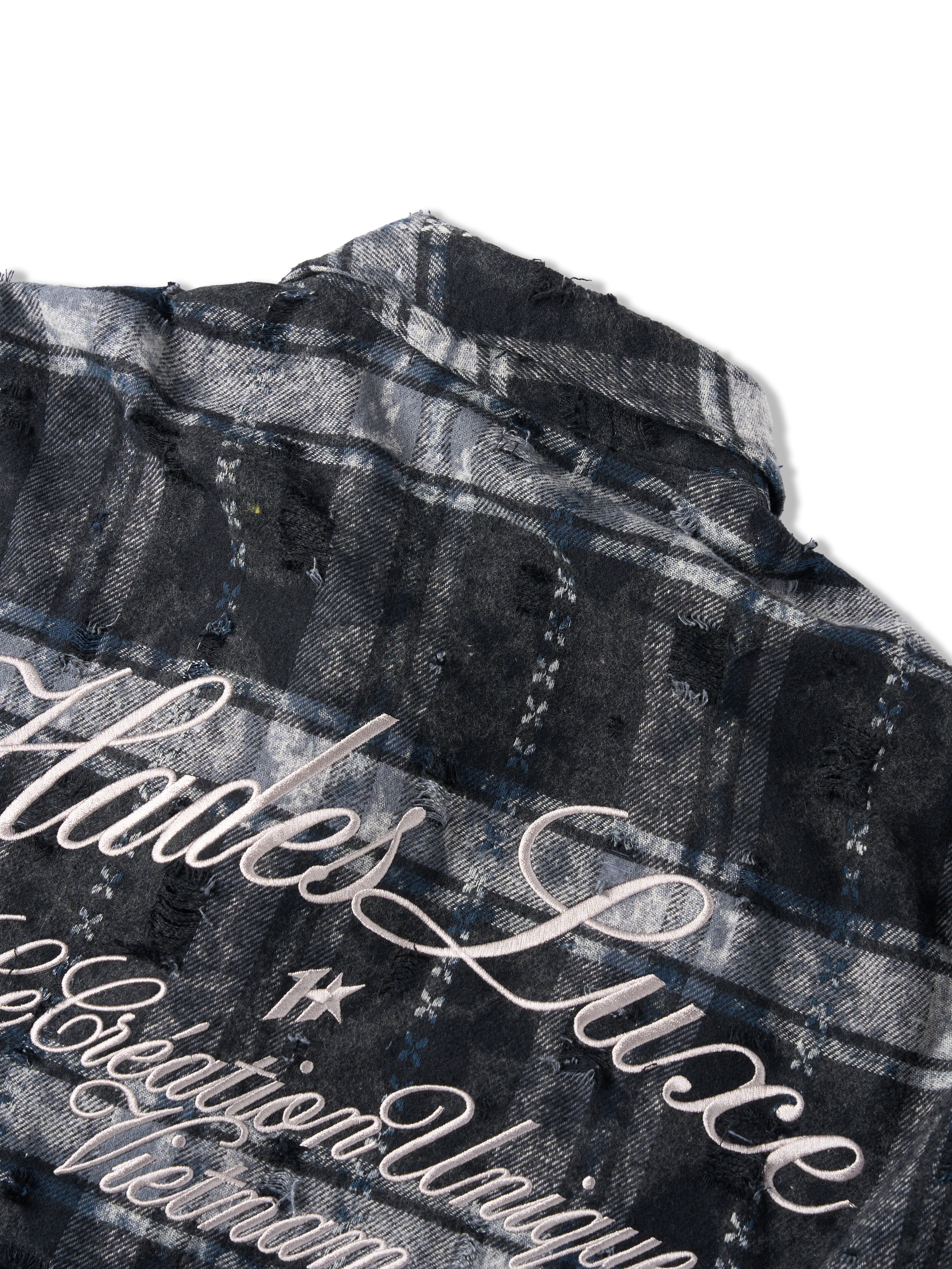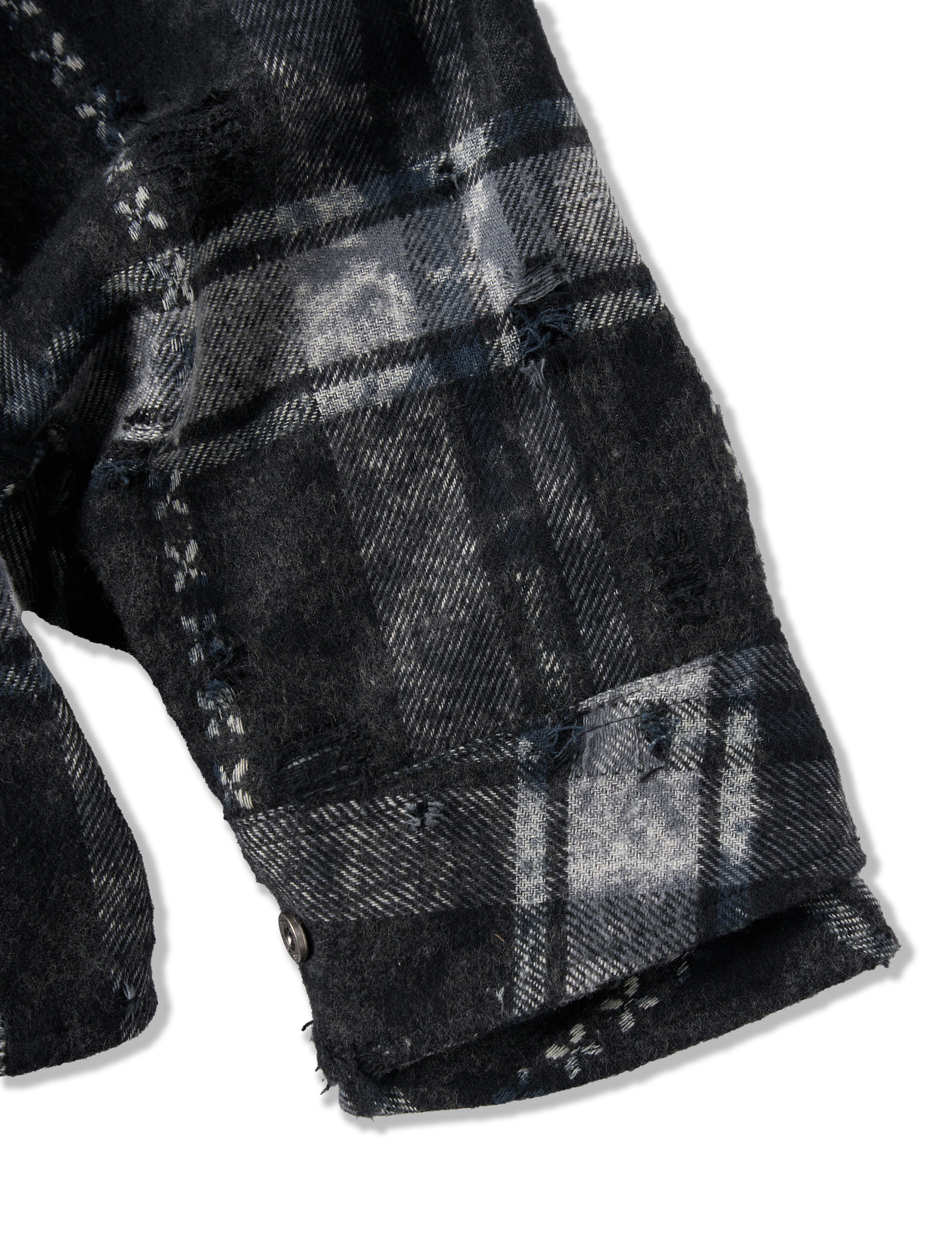 • Plaid pattern combined with distressed details and raw-edge stitching