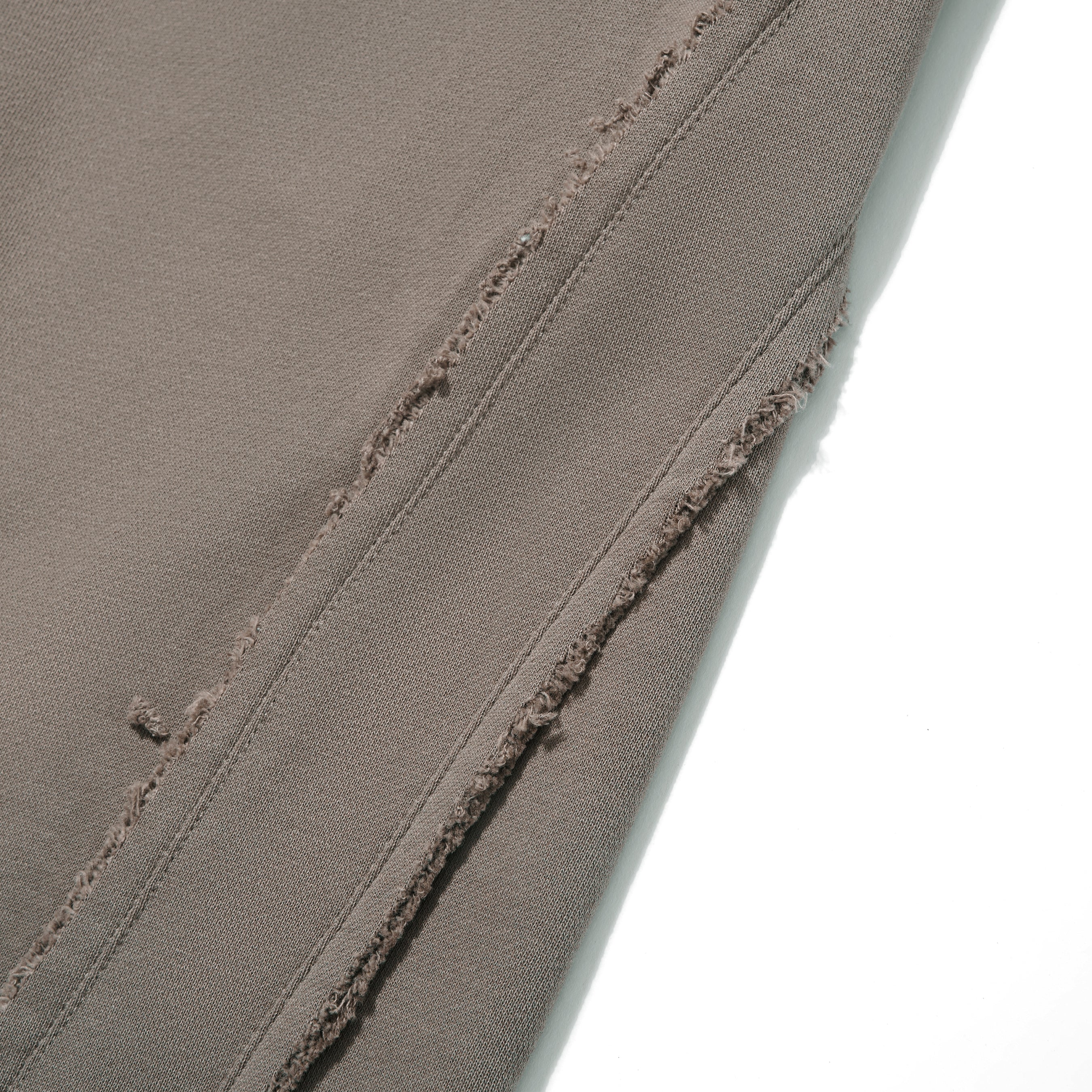 - Distressed details and vertical pleats on the front and back of the pants