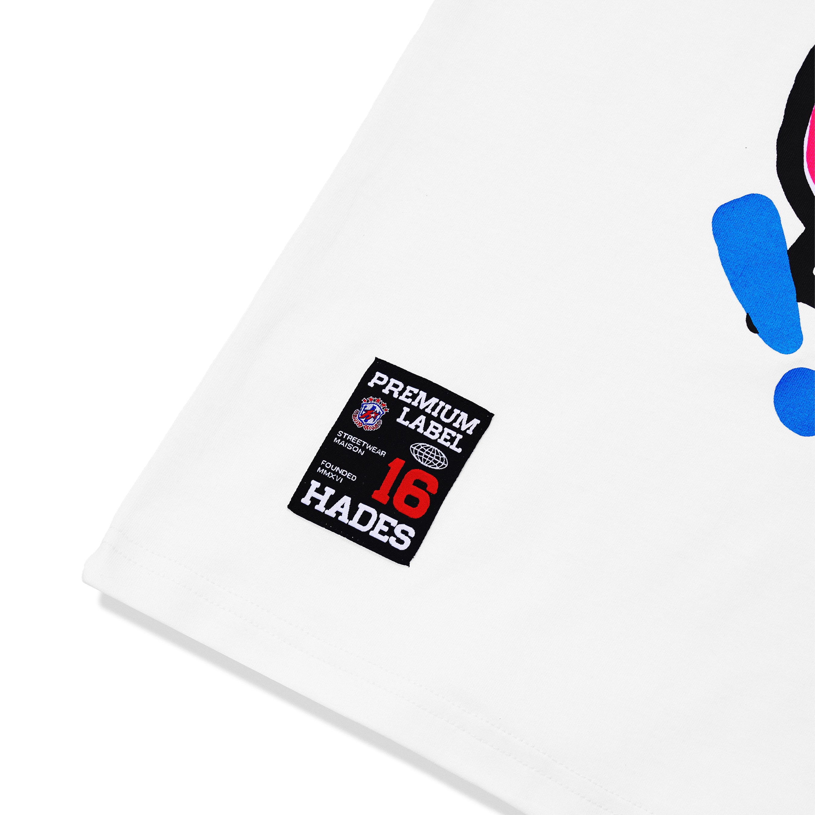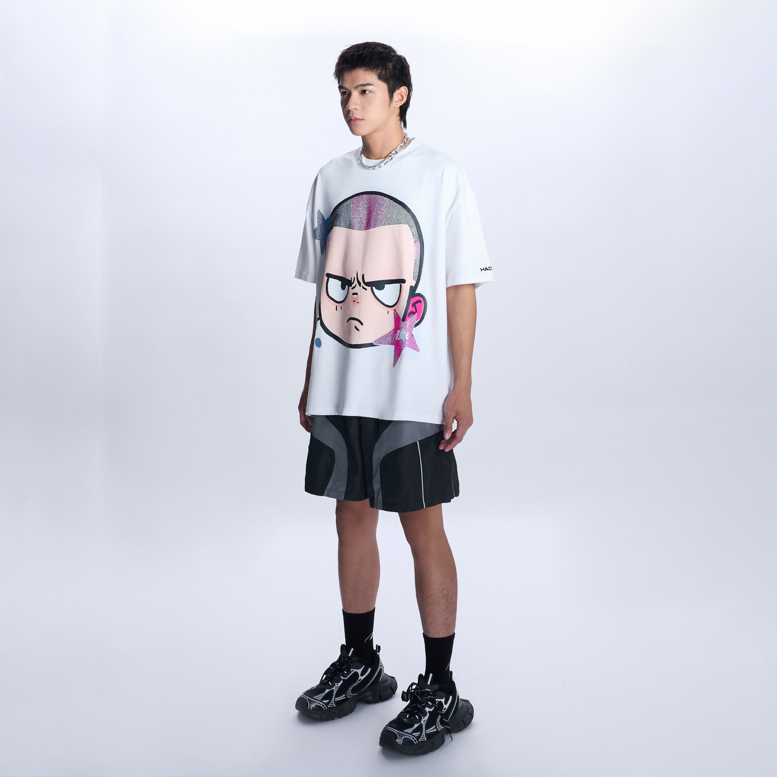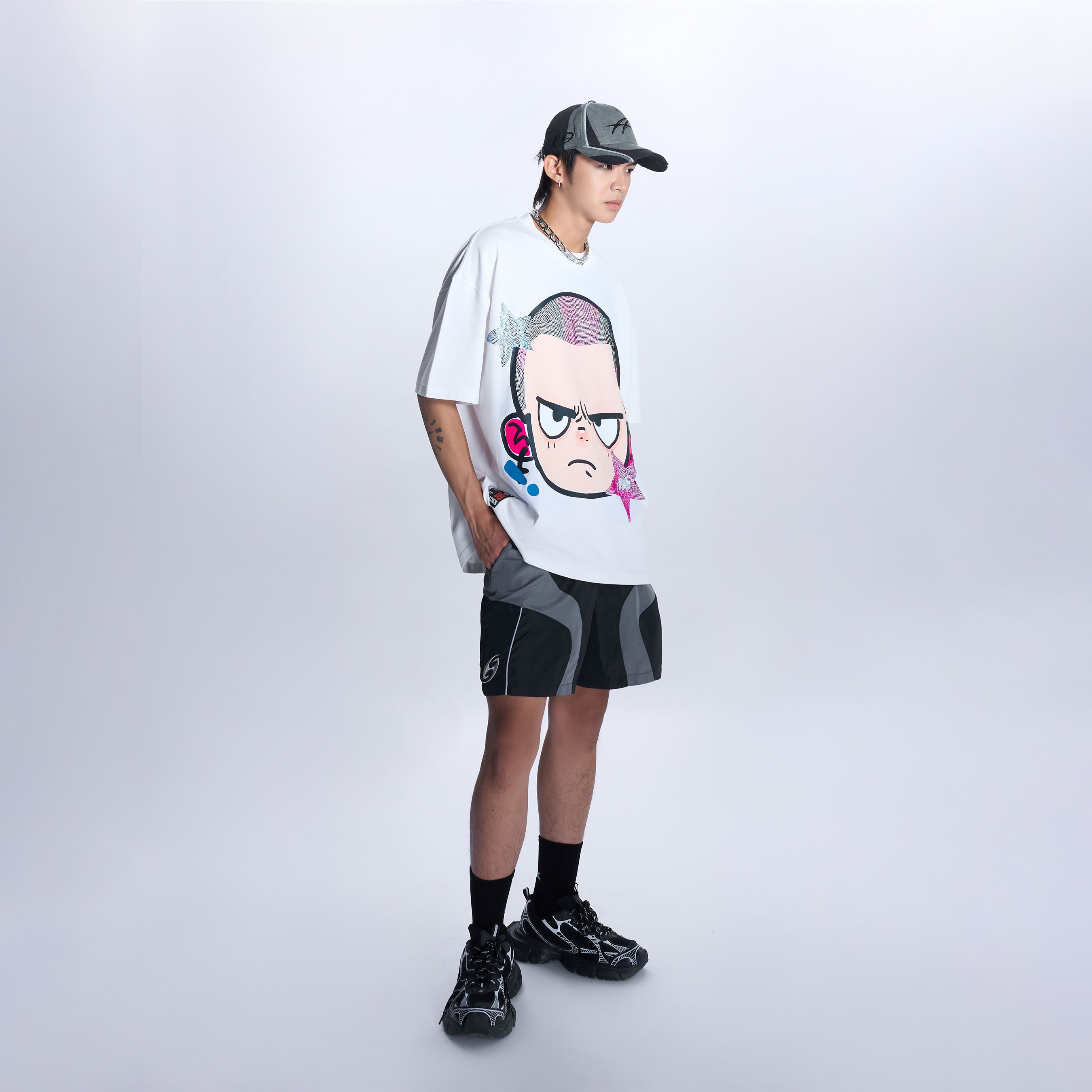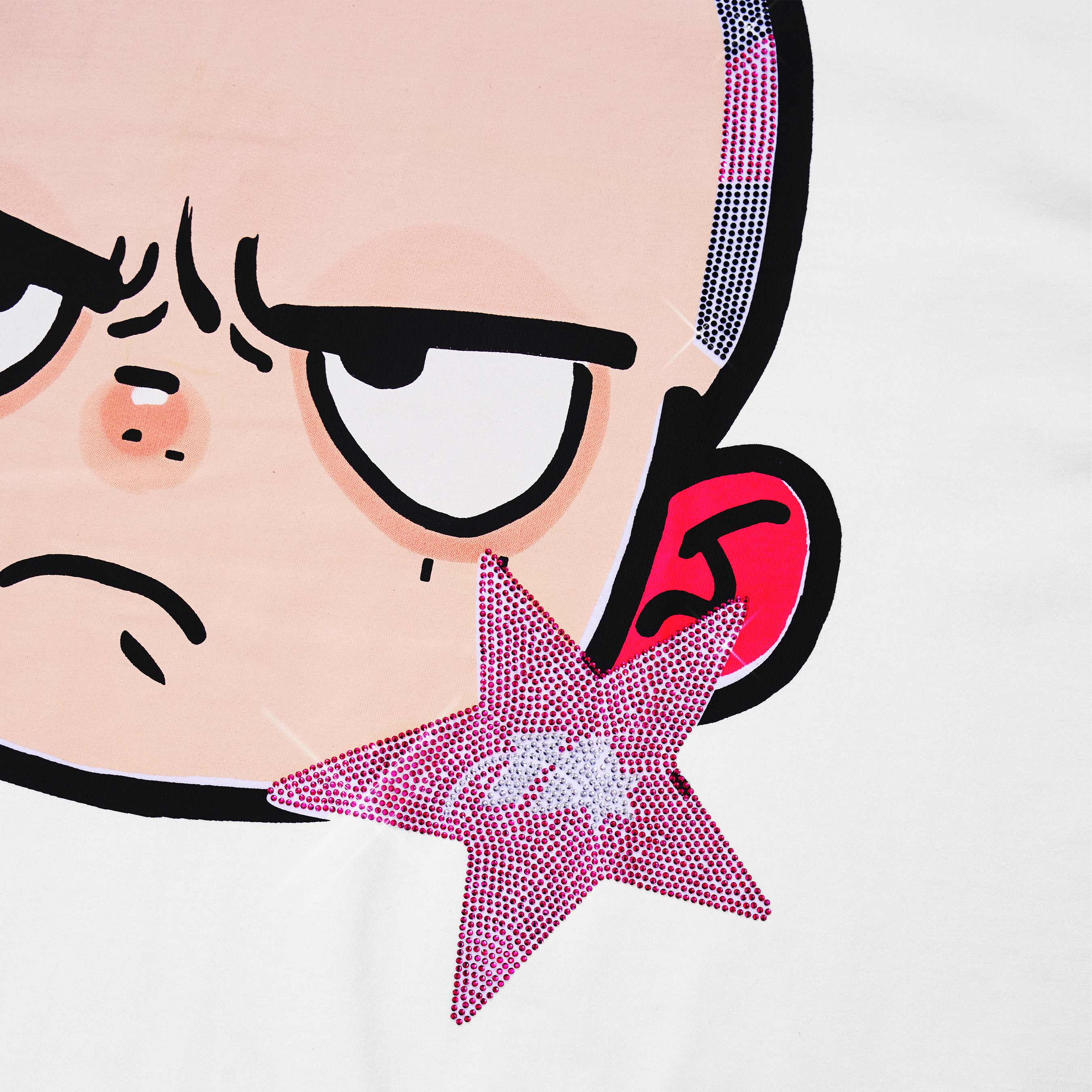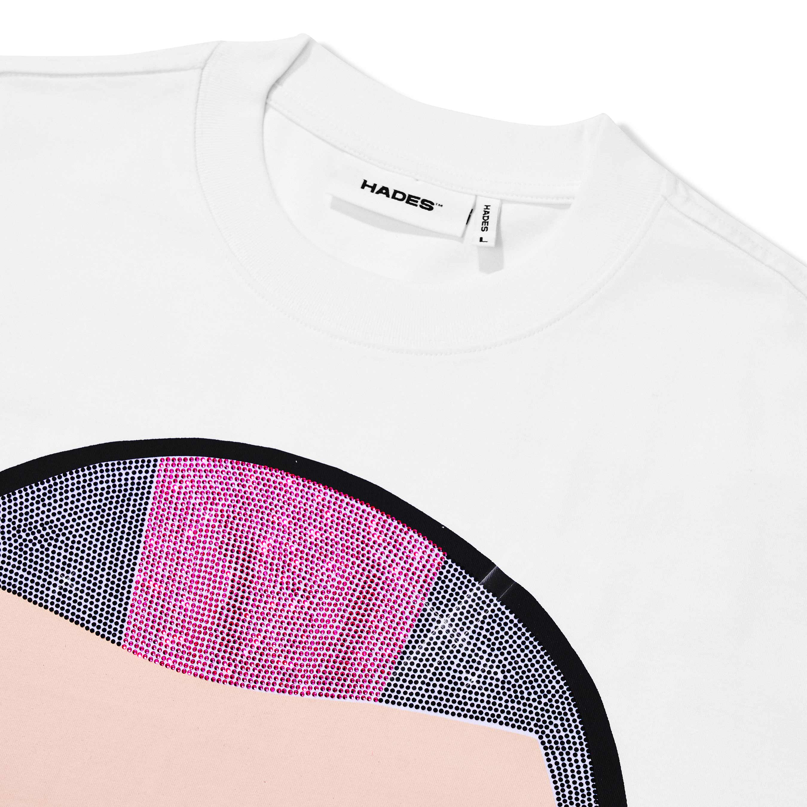 • Graphic design combining silkscreen printing and rhinestone decal techniques