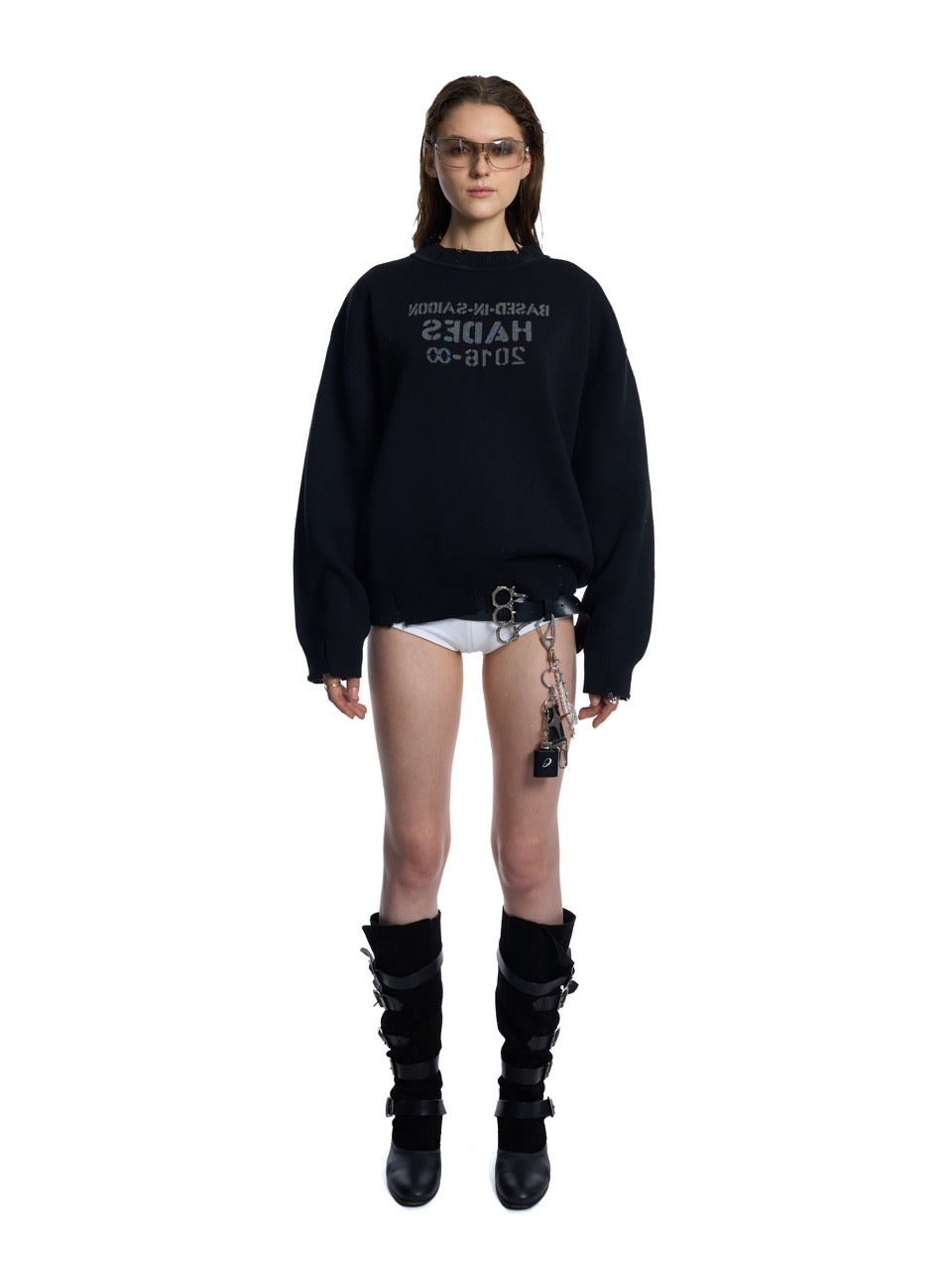 • Ribbed neck, cuffs, and hem with distressed finishing