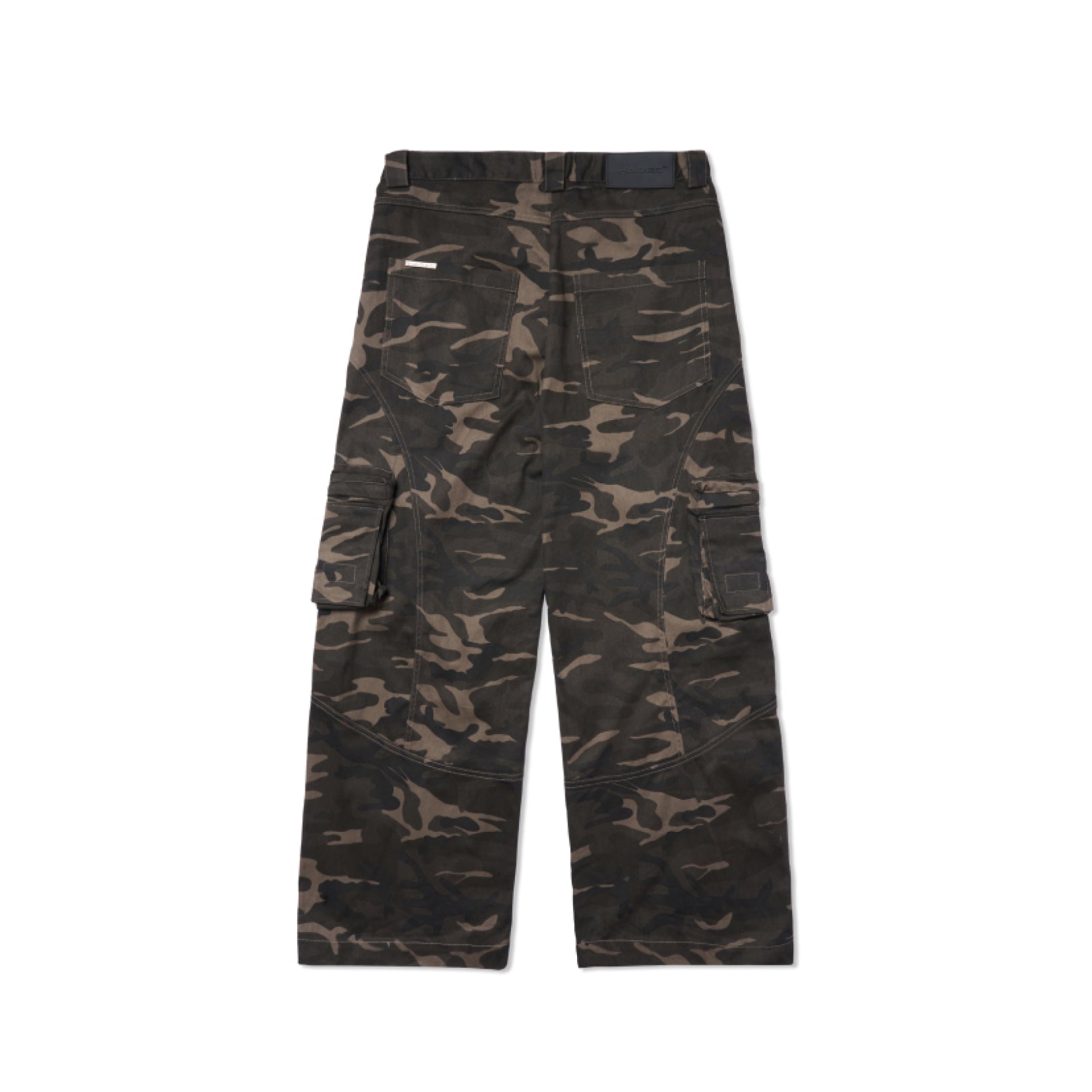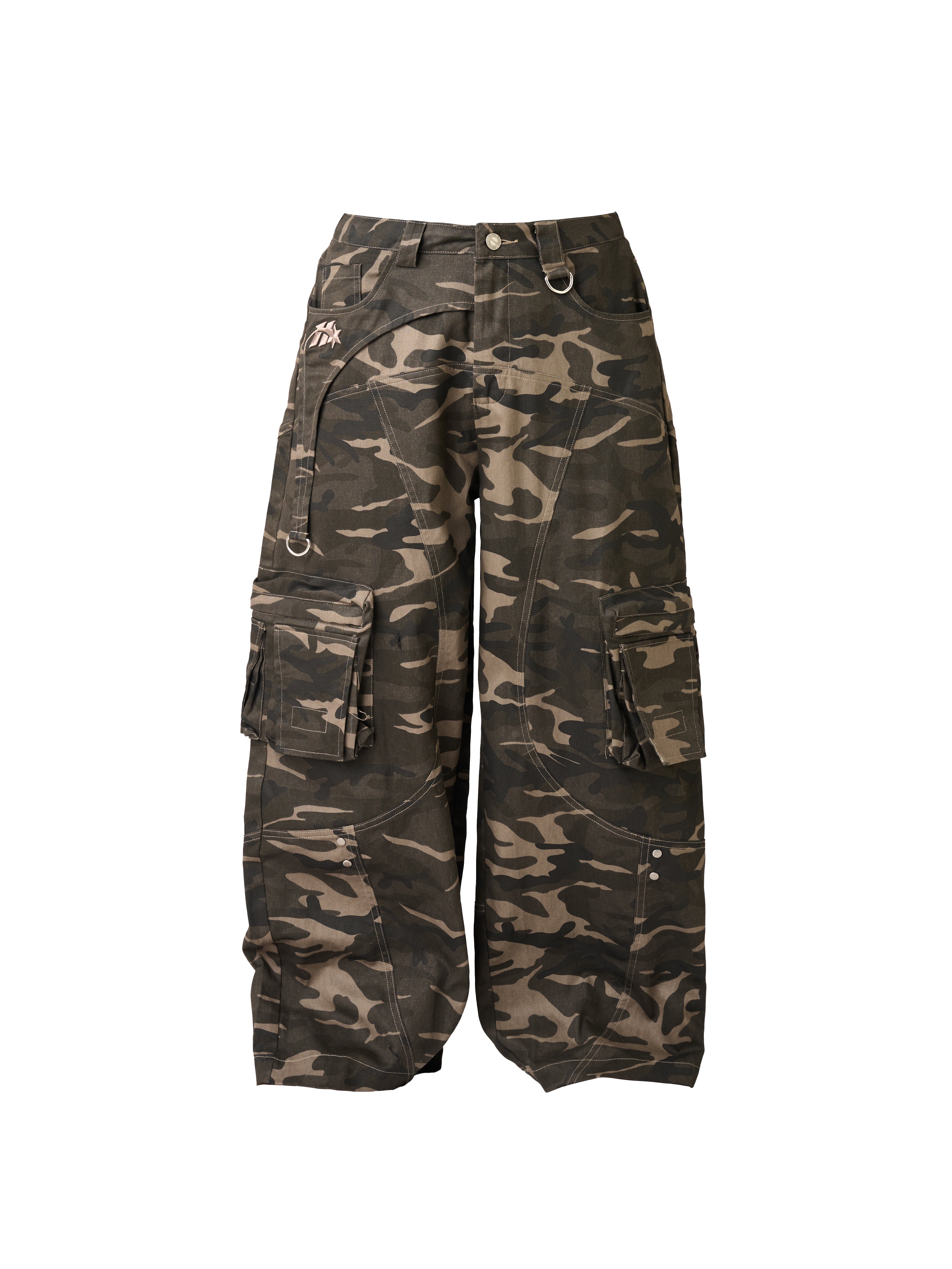 • Wide-leg camo pants with floor-length design